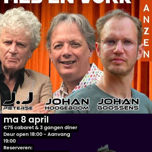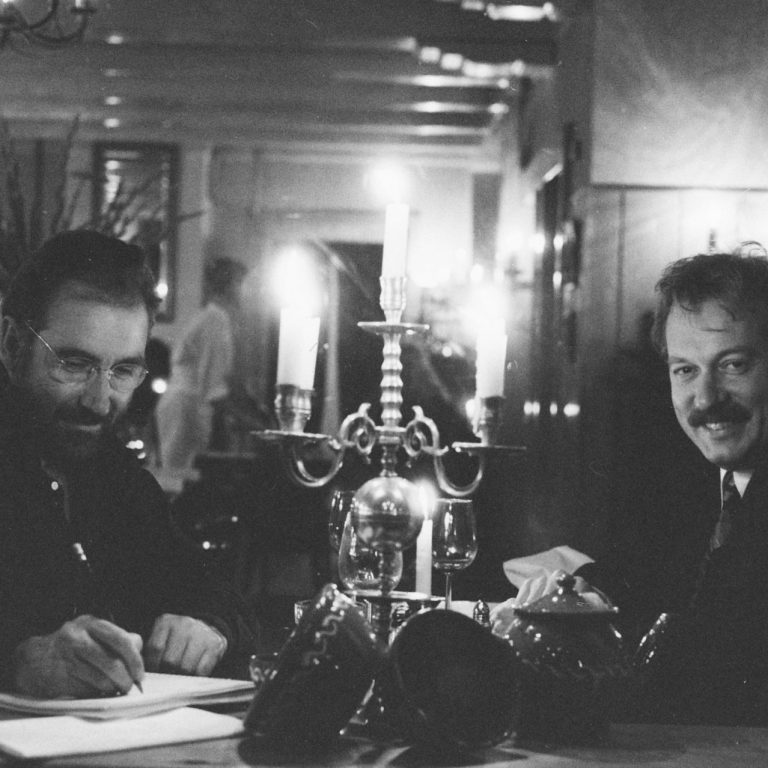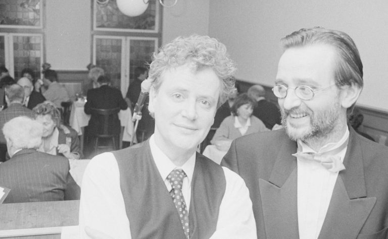 Op de foto links Frank Huissen (rechts) met Jan J. Pieterse in de begintijd van Cultuur met Mes & Vork. De eerste jaren vonden de uiterst succesvolle cabaretavonden plaats in De Ark. Later ging de formule op tour langs grotere locaties tot zelfs een keer in de lobby van het toenmalige Concertgebouw.