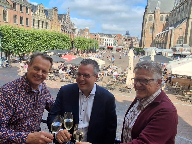 Organisatoren van Haarlem Culinair, Luuk Hasselman (l) en Henny Leeflang met in het midden Patrick Uitendaal, de man die het stokje vanaf 2025 na 30 jaar gaat overnemen.
